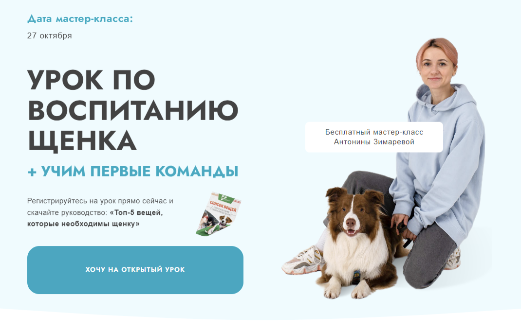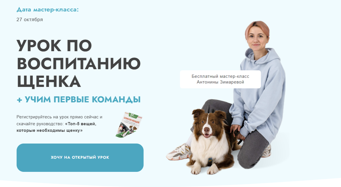 Наш клиент — онлайн школа по воспитанию щенков. Трафик ведем на бесплатный вебинар, который проходит каждый день. Средний чек продукта — 30.000 рублей.